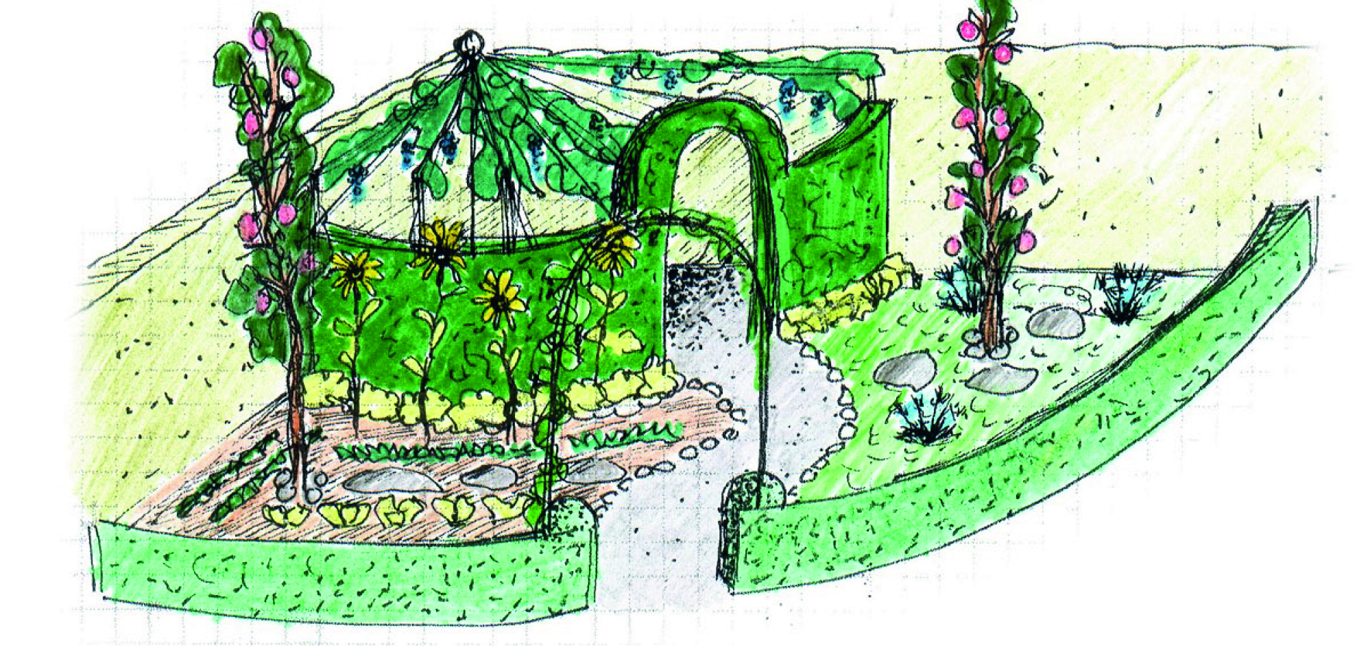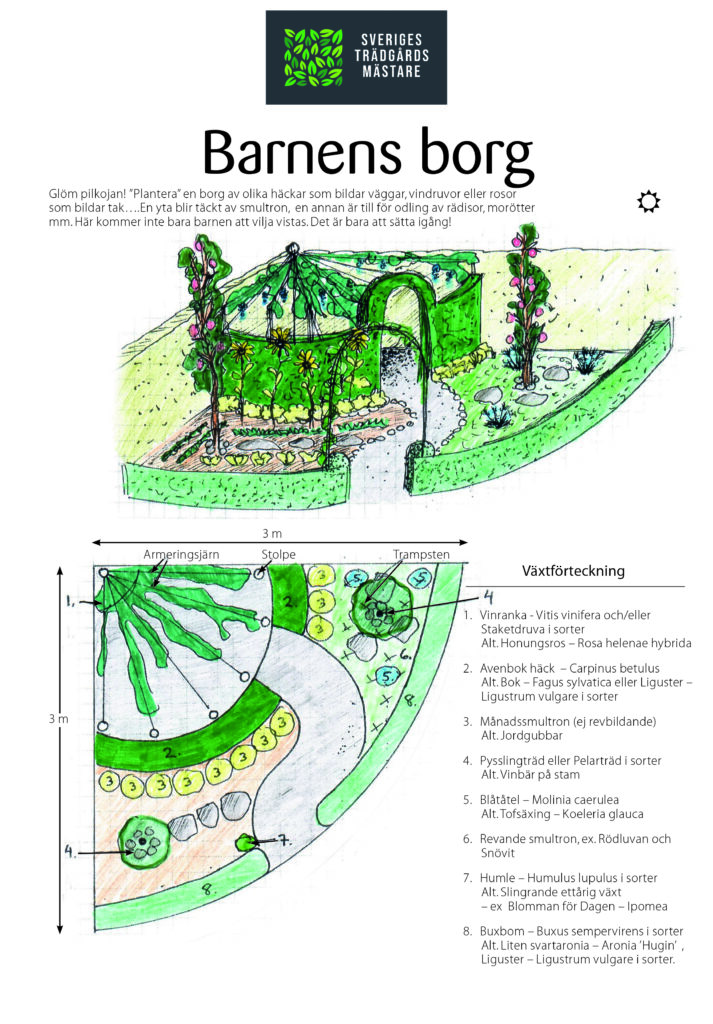 Glöm pilkojan! ”Plantera” en borg av olika häckar som bildar väggar, vindruvor eller rosor som bildar tak….En yta blir täckt av smultron, en annan är till för odling av rädisor, morötter mm. Här kommer inte bara barnen att vilja vistas. Det är bara att sätta igång!