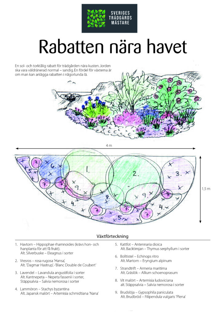 En sol- och torktålig rabatt för trädgården nära kusten. Jorden ska vara väldränerad normal – sandig. En fördel för växterna är om man kan anlägga rabatten i någorlunda lä.