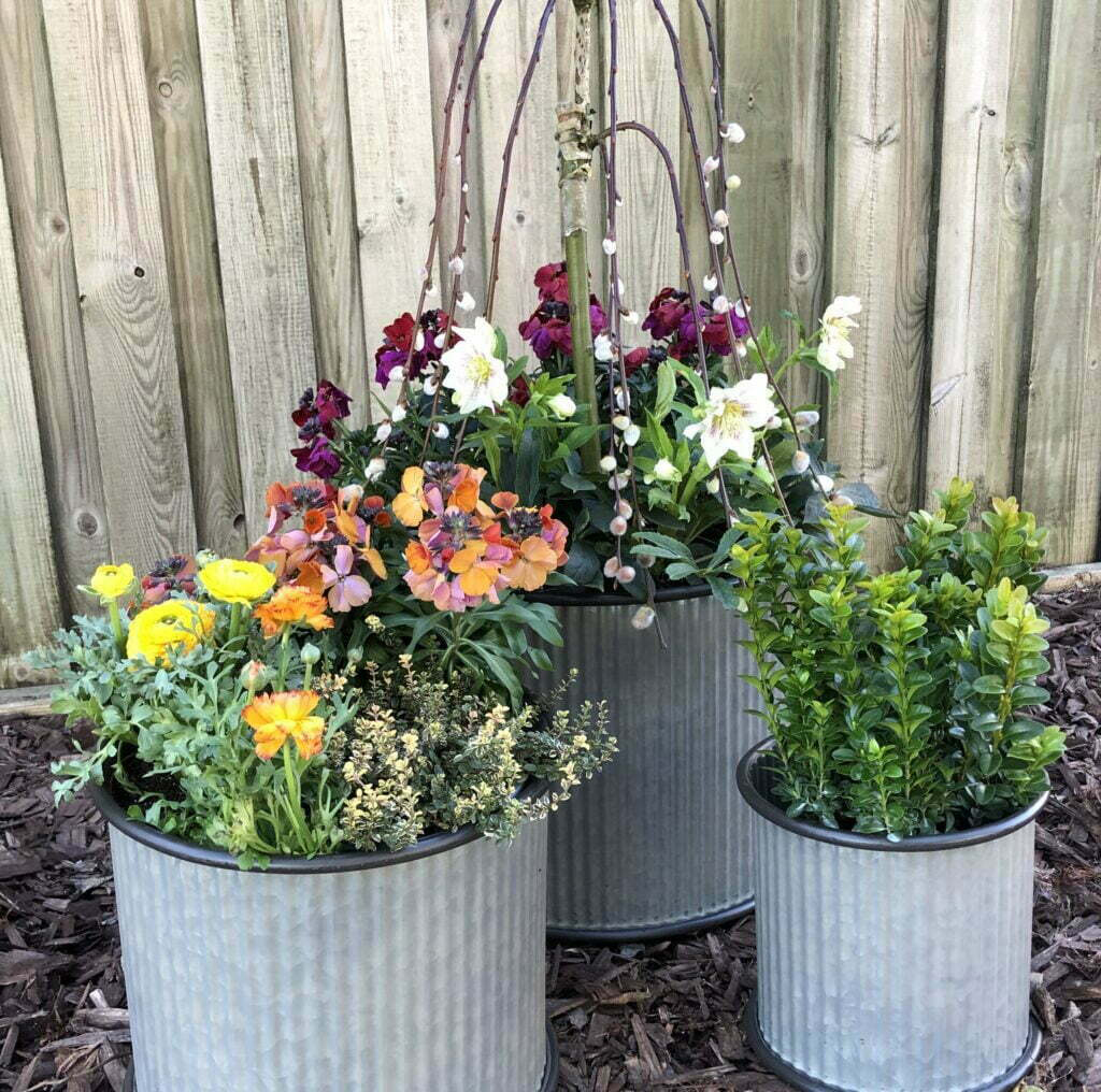 Vill du ha mer volym och liv? Plantera små träd i krukor, som dvärgsyren, dvärgkörsbär eller olika sorters sälg (Salix). Glöm inte att ta tillvara på kvistar och grenar från trädgården – de blir fina som dekoration eller stöd i dina planteringar.